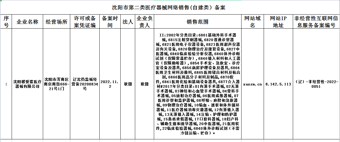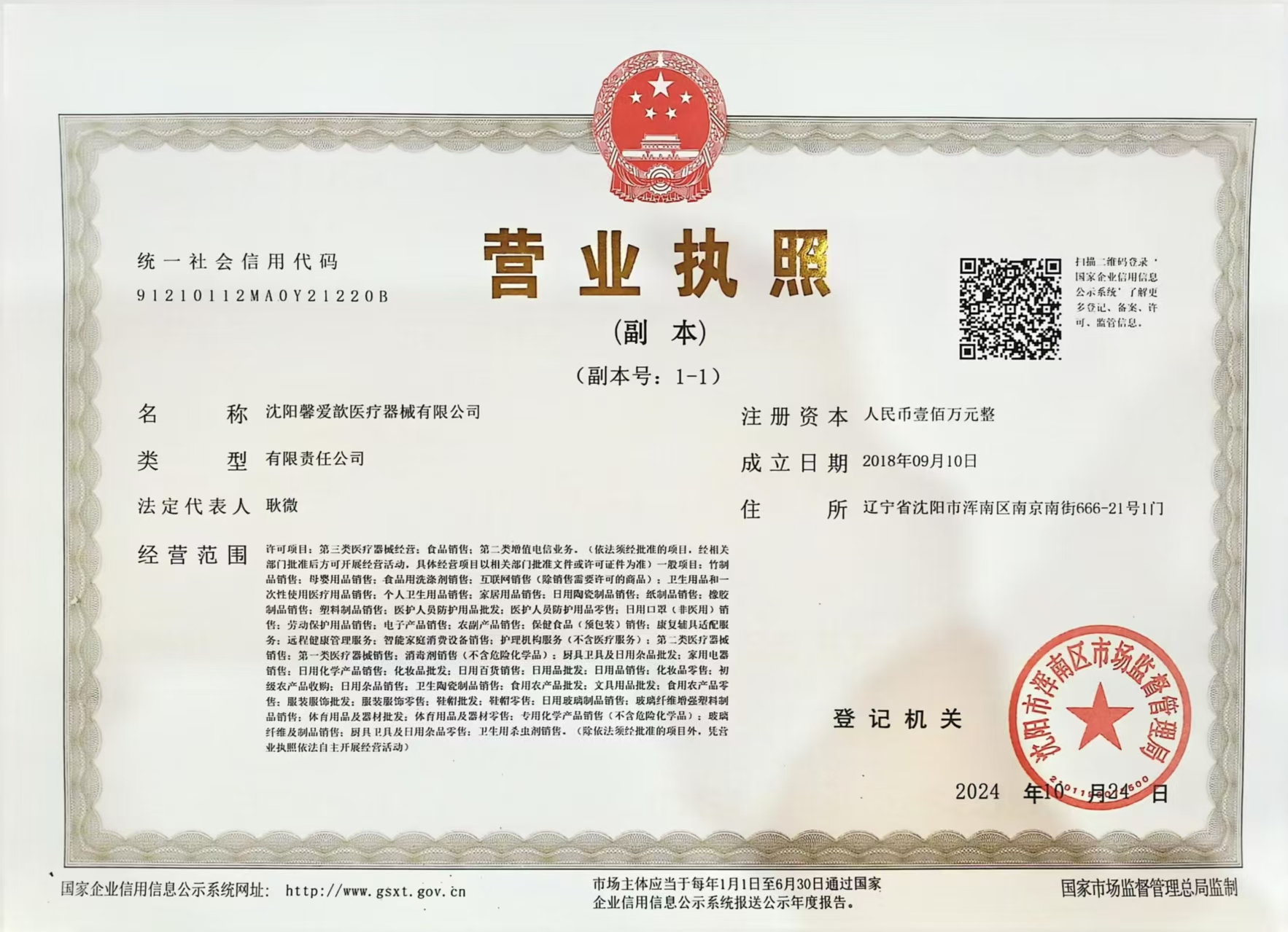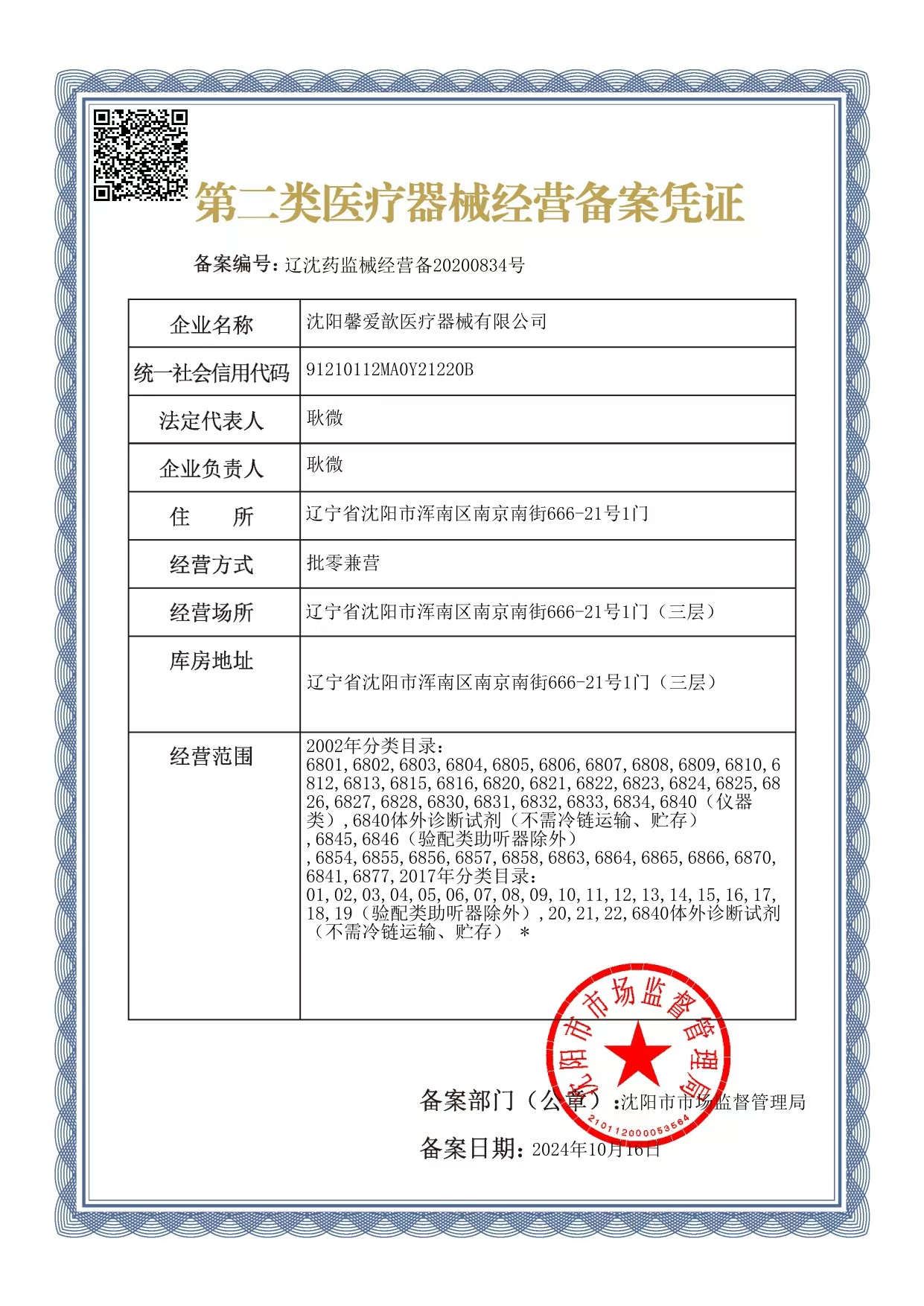 沈阳馨爱歆医疗器械有限公司,成立于2018-09-10,注册资本为30万人民币,法定代表人为耿微,经营状态为存续,工商注册号为210112000207324,注册地址为辽宁省沈阳市浑南区南京南街666-21号1门,经营范围包括医疗器械、食品、保健食品、消毒消杀用品、健身器材、化妆品、日用百货、服装、鞋帽、玻璃制品、初级农产品、家用电器、陶瓷制品、保健用品、文化用品、电子产品销售;初级农产品收购。(依法须经批准的项目,经相关部门批准后方可开展经营活动。)
